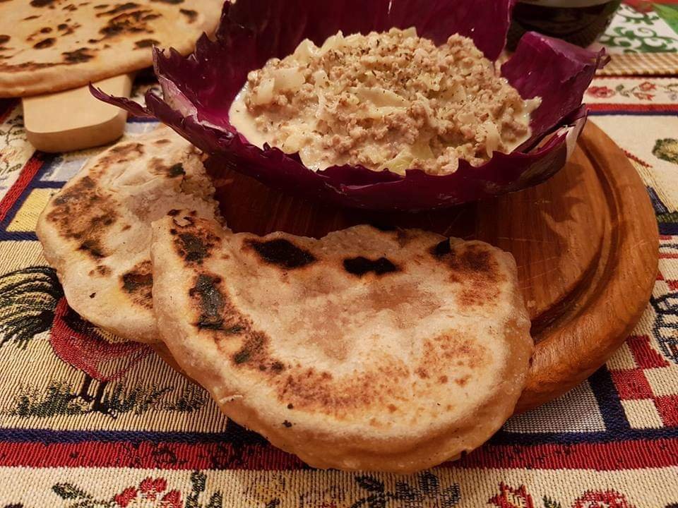 Das Kraut fein schneiden und kurz in Wasser mit etwas Salz kochen ca. 2 min, abseihen und die Brühe auffangen. Hackfleisch imTopf mit Öl anbraten, dann Zwiebeln und Knoblauch zugeben, leicht sollte alles gebräunt sein! Das Kraut dazugeben und mit etwas von der Brühe ablöschen, aber nur soviel Brühe wie nötig. Gewürze und Lorbeerblätter zugeben und ca 5 min kochen dann den Schmand unterrühren, nicht mehr kochen! Schön sieht es aus in Krautblätterschalen serviert! Dazu Fladenbrot, Baguette geht auch, sollte was zum tunken sein!