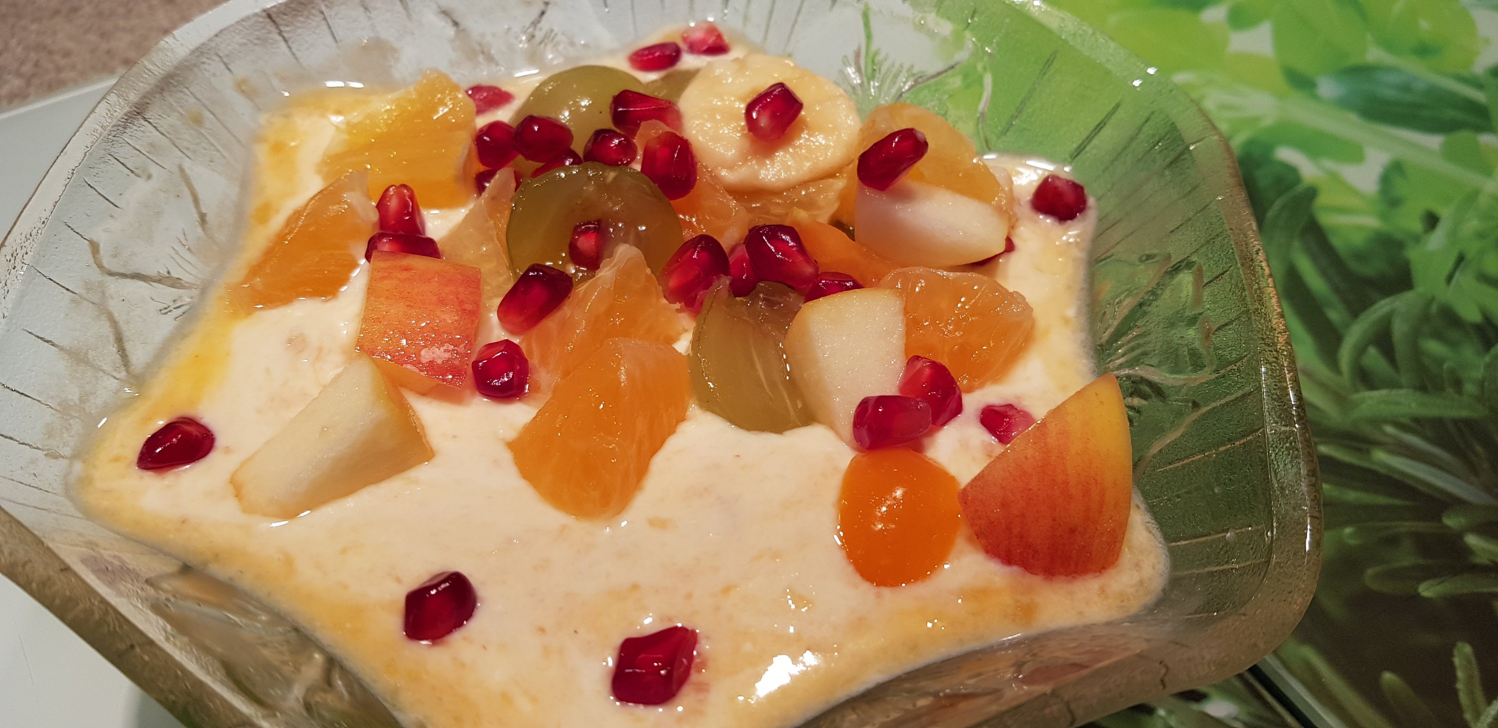 Zum Dessert Kakiquark mit frischen Obstsalat!