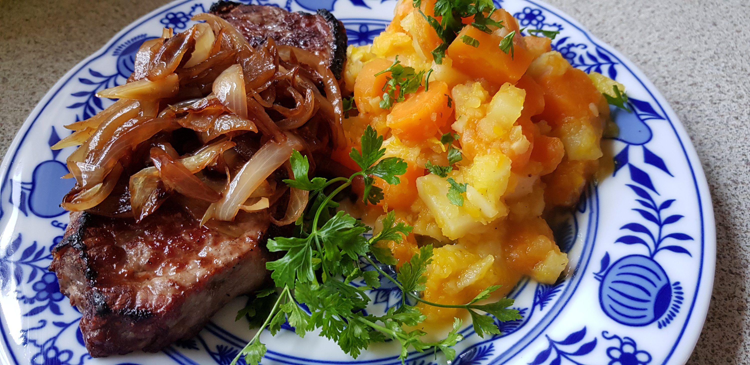 Wurzelgemüse- Kürbisstampf, mit Rumpsteak