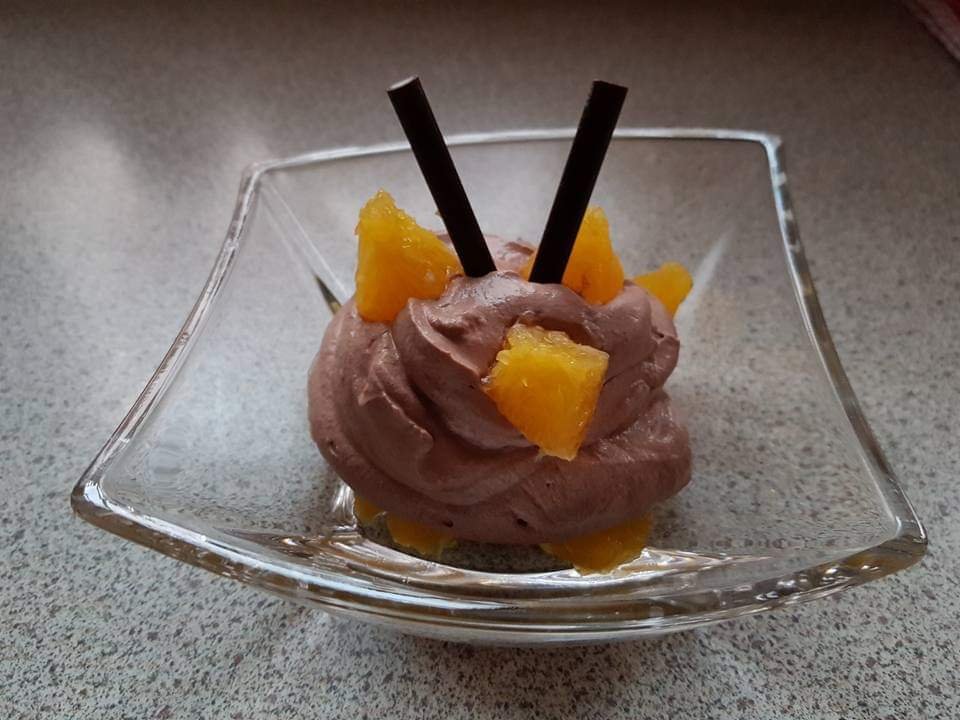 1Becher Sahne steif schlagen, bevor zu fest 1-2 Esslöffel Kakao und Puderzucker, Vanillezucker und Joghurt zufügen! Orangenfilets mit Orangenlikör beträufeln!