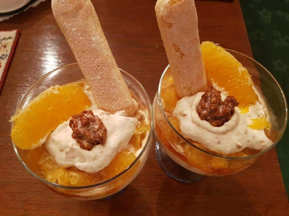 Anrichten im Glas: erst zerbröselte Löffelbisquit, dann die Nüsse unter die Sahne heben und auch einfüllen, unter die Orangenstückchen 1 Esslöffel Orangenlikör mischen, auch ins Glas füllen, am Schluss mit Sahne, Orangenfilet und Löffelbisquit dekorieren! In einem hohen Glas kann man auch alles in mehreren Schichten einfüllen! 🌰🍊