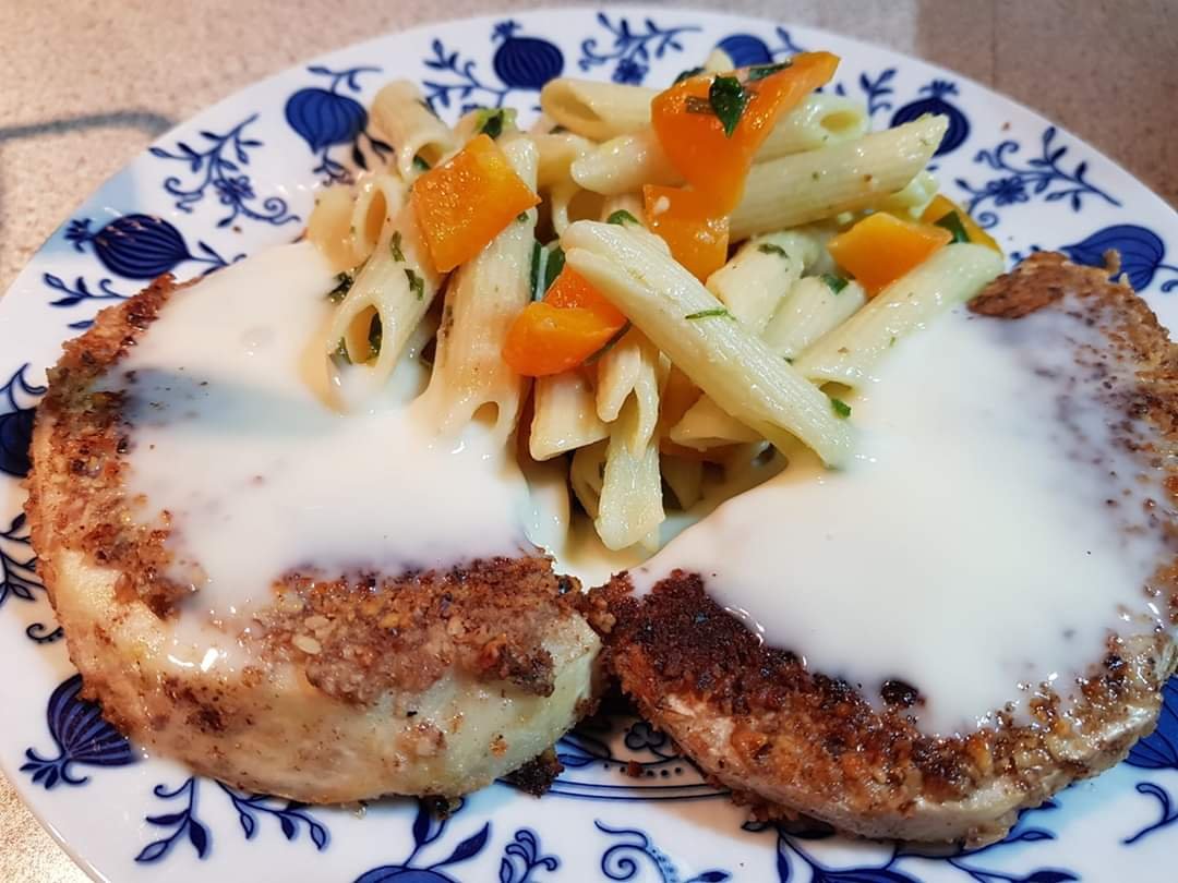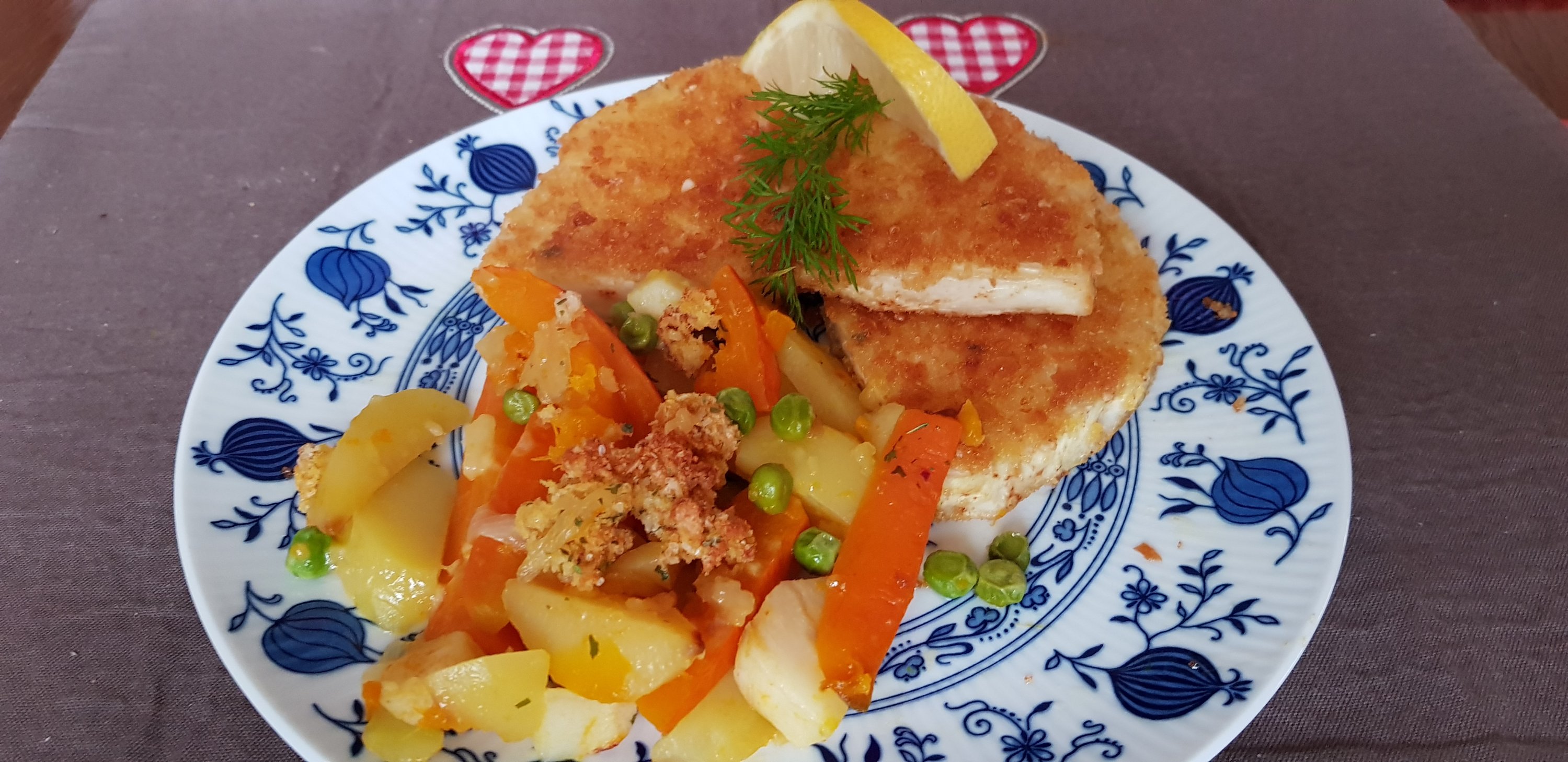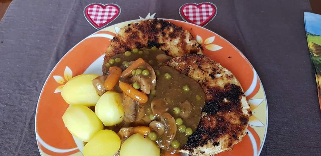 Das ist ganz einfach wie Schnitzel würzen und panieren! Für die Soße eine kleine Dose Erbsen mit Möhrchen und eine Dose Champignons, ich hatte noch leckere Soße eingefroren, die mal übrig blieb, so war die Pilz- Gemüsesoße perfekt!