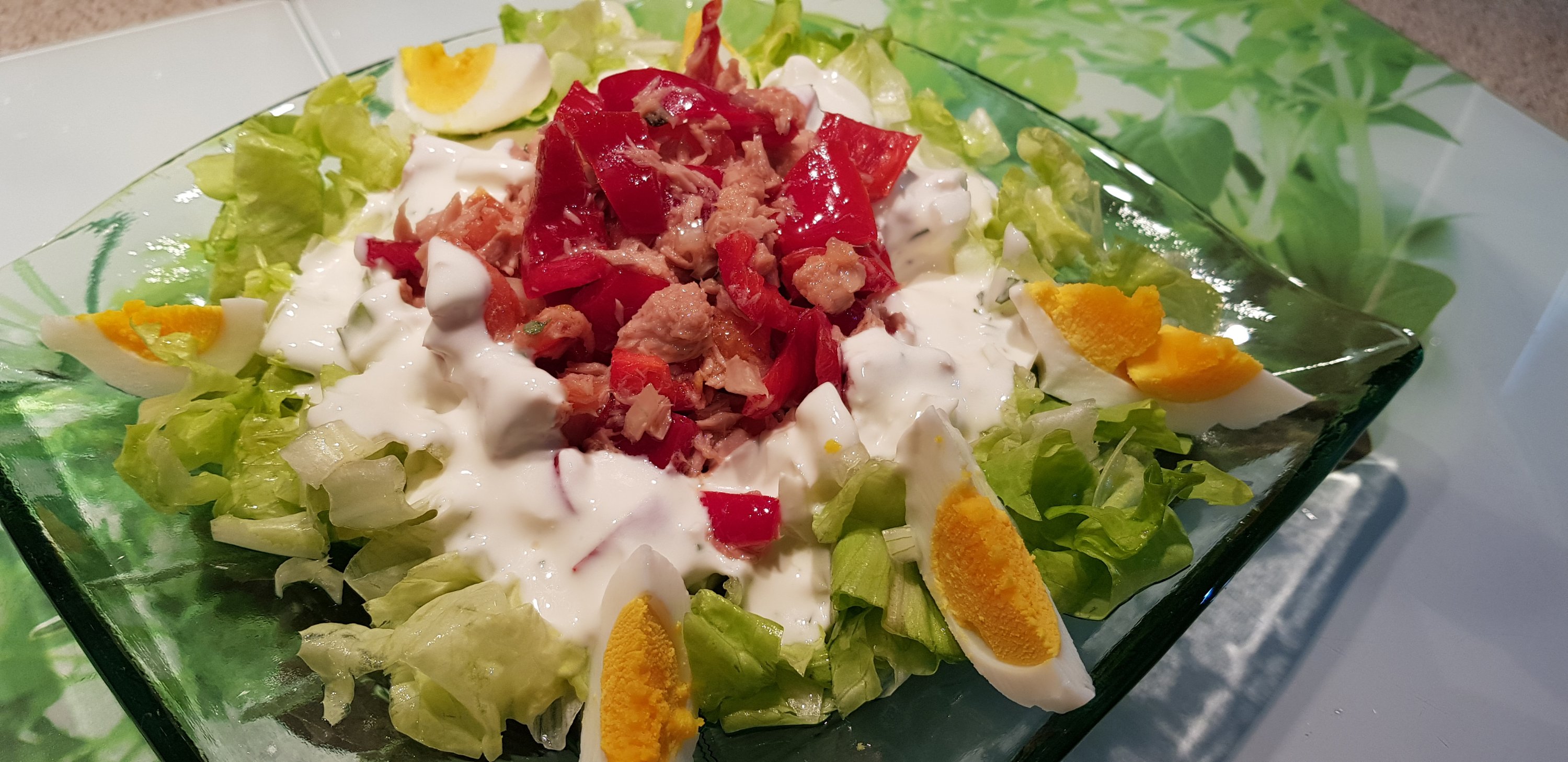 Thunfisch mit gewürfelter Zwiebel, Knoblauch, Paprika und Tomaten in kleinen Stückchen, Salz, Pfeffer, Essig und Öl, Kräutern abschmecken..