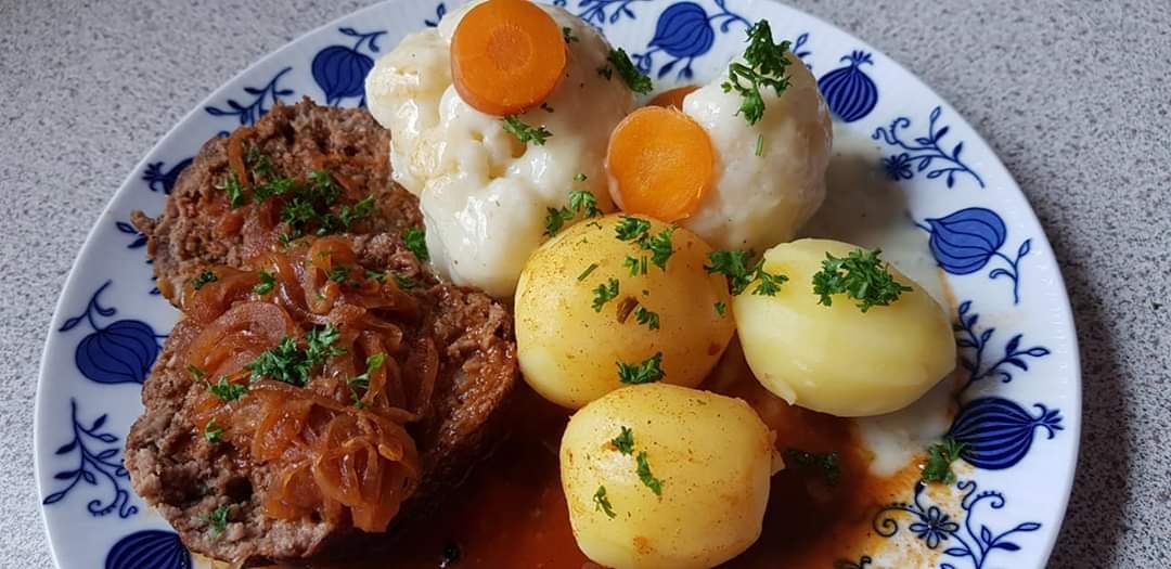 Hackbraten mit Zwieblelsoße, Blumenkohl und Salzkartoffeln