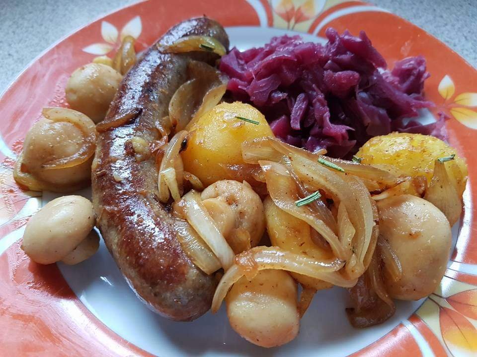 Kartoffeln kochen, Bratwurst in Butterschmalz gut anbraten, dann geschnittene Zwiebeln, evtl. bisschen Schinkenwürfel dazugeben auch anbraten, frische oder Glas Champignon dazu, am Schluss noch die Kartoffeln, kurz mit braten und würzen mit Salz, Pfeffer, gemahlenem Kümmel, Knoblauchzehe zerdrückt, oder Knoblauchpulver, etwas Rosmarin!