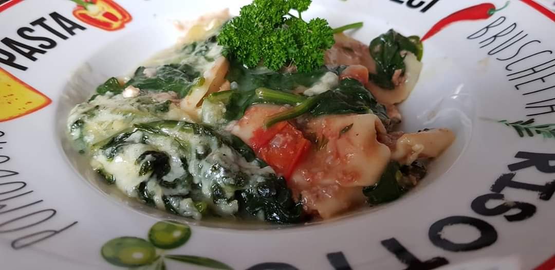 Bechamelsoße mit der Spinatbrühe zubereiten und oben drauf! Die Menge hab ich leider nach Gefühl gemacht! Schon gut drauf geben, sonst wird es zu trocken!