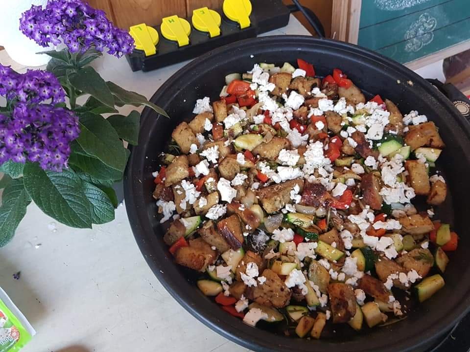 Etwas anbraten, dann Kräuter Rosmarin, Thymian, Oregano, Salz, Pfeffer… zugeben, kurz Deckel drauf, zum Schluss Schafkäse drüber bröseln und nochmal kurz Deckel drauf!