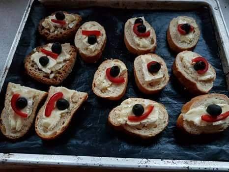 Überbackene Camembertbaguettes Baguette mit Butter bestreichen fein gewürfelte Zwiebelstückchen drauf, würzigen Camembert Bei 160 Grad ca. 5 min in den vorgeheitzten Backofen – schnell und lecker – – kann man auch gut mit bisschen trockenem Brot machen –