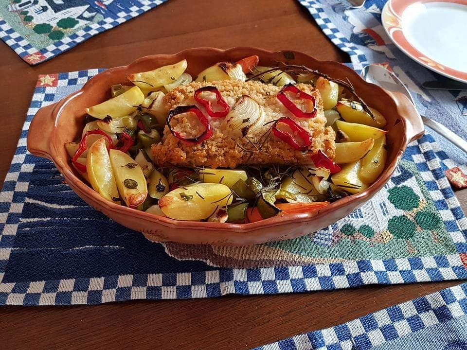 TK- FISCH in die Mitte der mit Öl ausgestrichenen Form legen. Das klein geschnittene Gemüse, Kartoffeln, Zwiebeln, Paprika, Staudensellerie, Karotten und was man mag, mit Salz, Pfeffer, Olivenöl und frischen oder Kräuter der Provence mischen, dann um den Fisch legen!