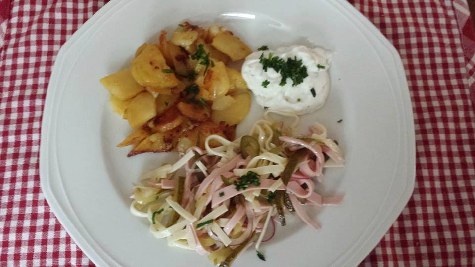 Lyoner, Emmentaler, Gewürzgurken in feine Streifen schneiden, 1 – 2 Zwiebeln in dünne Ringe hobeln, alles in eine Schüssel, dann mit etwas Senf, Salz, Pfeffer, Essig und Öl abschmecken, wenn vorhanden etwas Petersilie und Schnittlauch dazu!