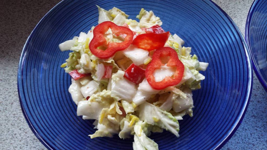 Chinakohl und Paprika kleinschneiden, Zwiebel fein hacken und Knoblauch ganz fein, dann mit der sauren Sahne, Apfelessig, etwas Öl und Gewürzen abschmecken!