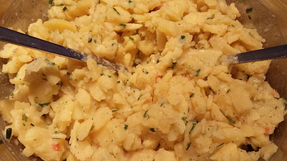 Pellkartoffeln nicht zu weich kochen und in Scheiben schneiden! Zwiebeln würfeln und in Butterschmalz, oder Öl leicht andünsten, wer mag eine klein geschn. Knoblauchzehe mit andünsten, Zwiebeln zu den Kartoffelscheiben geben, das ganze mit einem aufgelösten Brühwürfel, oder Pulver ( Menge nach Kartoffelmenge) übergießen, anschließend mit Apfelessig, Öl, Salz,Pfeffer, Muskat abschmecken! Mit Petersilie und bisschen Schnittlauch passt auch gut!