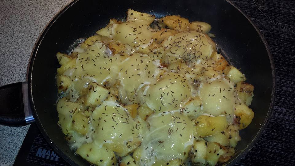 Ganz einfach, Zwiebeln und 1 ganz fein gehackte Knoblauchzehe in Butterschmalz leicht andünsten, (auch Reste Kartoffelverwertung) gekochte Katoffeln in Scheiben oder Würfel schneiden zu den gedünsteten Zwiebeln geben, mit Salz , Pfeffer, Muskat, (gern auch Kräutern wer mag) würzen und ein wenig Kümmel! Alles noch etwas anbraten, beschichtete Pfanne nehmen, zum Schluß mit Handkäsescheiben belegen, kurz Deckel drauf mit Kümmel bestreuen! FERTIG!!!!