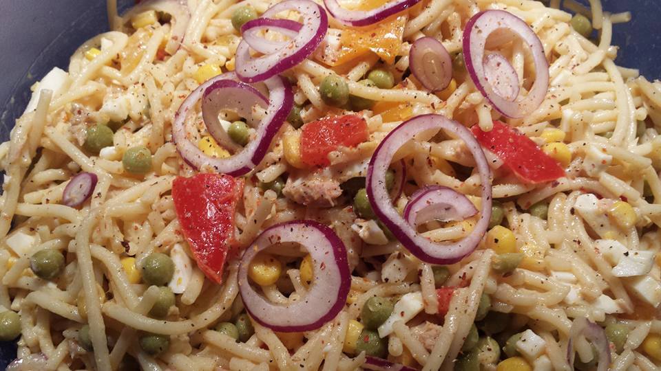 gekochte Spagetti (waren ca. 300- 400 g?) bisschen klein schneiden, 5 fest gekochte Eier klein schneiden, 1 Dose Thunfisch ohne Öl zerkleinert, 1 Glas gegrillten Paprika auch klein schneiden, eine kl. Dose Erbsen und eine Mais, eine rote Zwiebel fein gehobelt, einen Teil von dem Sud vom Paprika , anstatt Öl nehmen, ist ja meistens in Öl eingelegt,