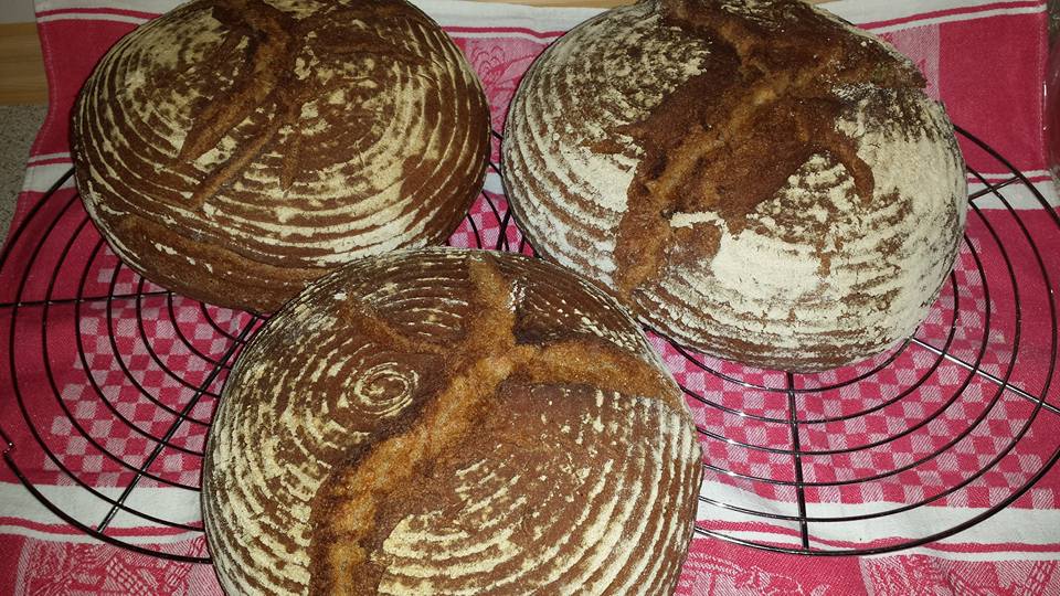 Sauerteig und alle Zutaten zu einem nicht zu festen Teig verkneten und ca. 60 min gehen lassen. Während der Gärzeit Teig 1-2 Mal kurz durchkneten! Anschließend Brot formen und im Gärkörbchen gut aufgehen lassen!