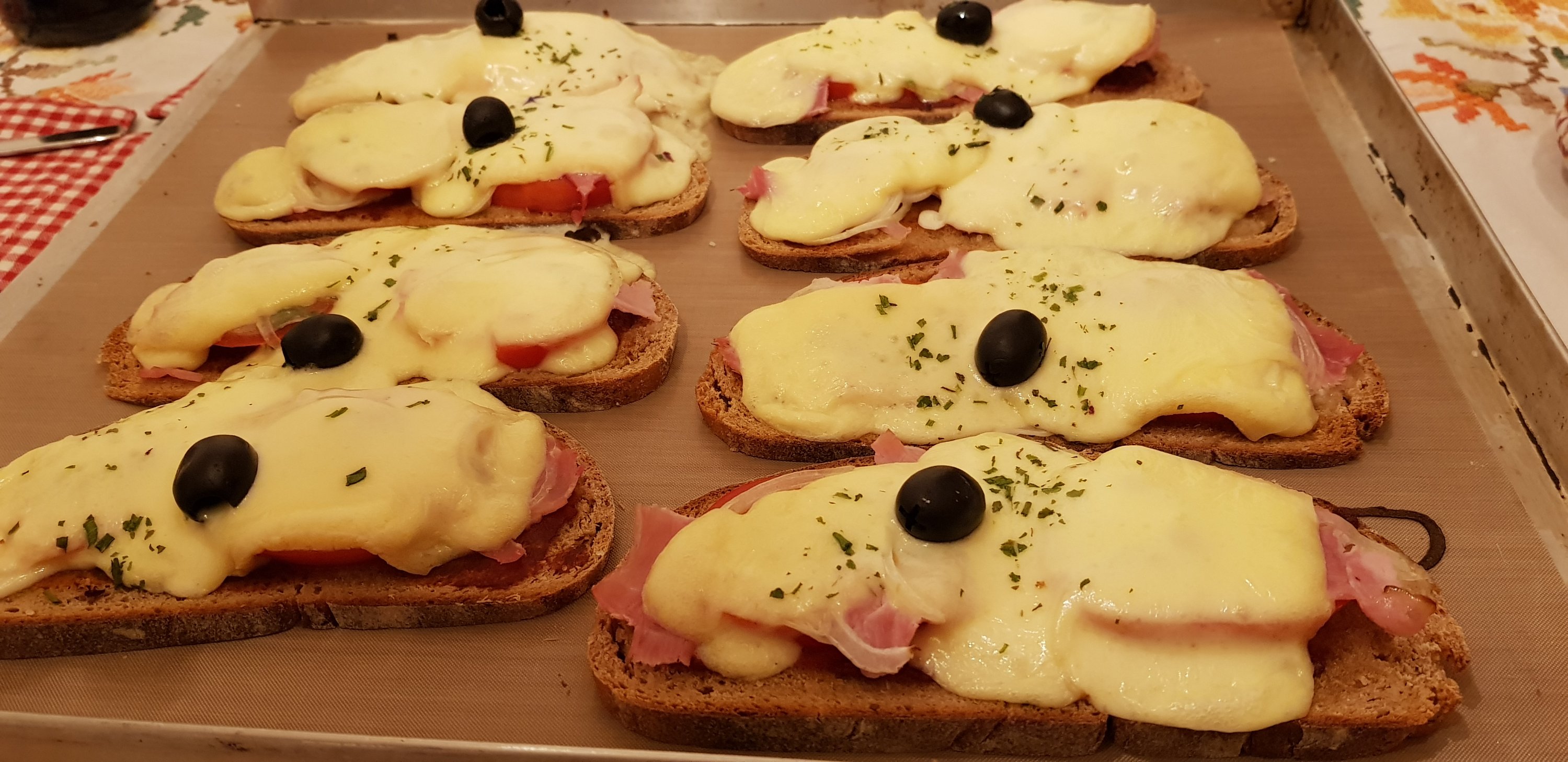 Brot überbacken mit Tomatenmark und Butter dünn bestrichen, geht auch mit Olivenöl, Pesto…,dann mit Tomaten, gekochtem Schinken, Zwiebeln, Oliven, Raclette Käse…und Alpenkräutern. Backen ca. 10 min 180 Grad