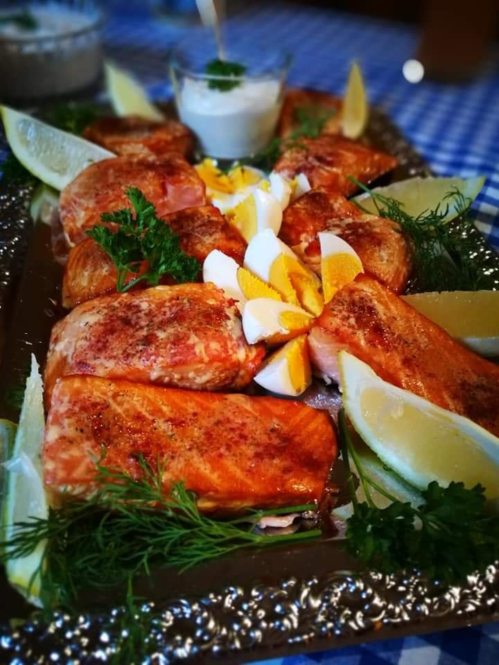 Eigentlich habe ich den Lachs fast so belassen wie er war! Ca. 2 Std.vorher aus dem Kühlschrank (in die Küche). Gleichzeitig habe ich den Räucherofen angeheizt (Holzgrillbrikett). Habe dann den wunderschönen Lachs aus der Verpackung und abgetrocknet (auch die Haut). Dann von evtl. Greteln befreit. Portioniert! Sollte bis Ostern reichen, schafft er aber nicht! So jetzt mit etwas „Danish Smoked Salt“ und zwar „ANKER KRAUT“ leicht einmasieren fast ohne Hand aufzulegen. Danach noch grobes Alpensalz (ich verwende grobes lieber) drüber. Noch etwas ruhen lassen und R-Ofen die Hitze kontrollieren. Temperatur war um die 90 konstant. Die Kohle wurde langsam weiß, jetzt Räuchermehl direkt auf die Kohle. Über der Kohle habe ich eine Auffangschale und ca. 50cm drüber ein Rost. Darauf kam der Lachs (Haut nach unten) und Deckel drauf. 30-40 Min 1.Sicht Kontrolle. „An Guadn“
