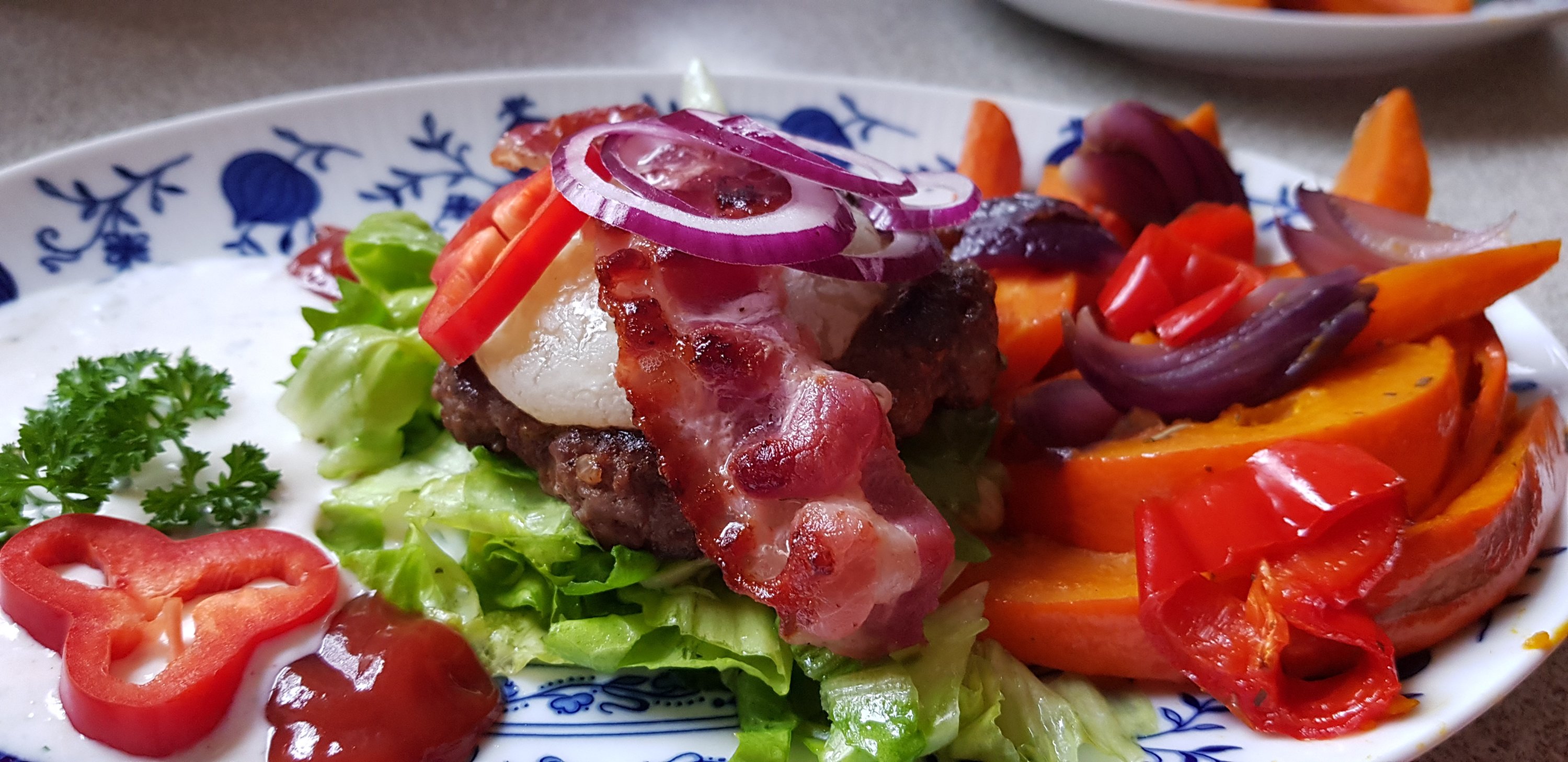 Rinderhack, mit wenig mini fein geschn. Knoblauch, etwas fein gewürfelter Zwiebel, Salz, Pfeffer würzen, flache Burger formen und vorher den Bacon/ Dörrfleisch dünn geschnitten anbraten aus der Pfanne nehmen, warm stellen und die Burger braten, wenn gar Hitze runterschalten und je einen Handkäse oben drauf setzen, Deckel auf die Pfanne, dauert ca. 5 min bis der Käse schmilzt, auf den Handkäse hab ich mit Gabel paarmal leicht drauf gedrückt….dann gleich wieder Deckel drauf…