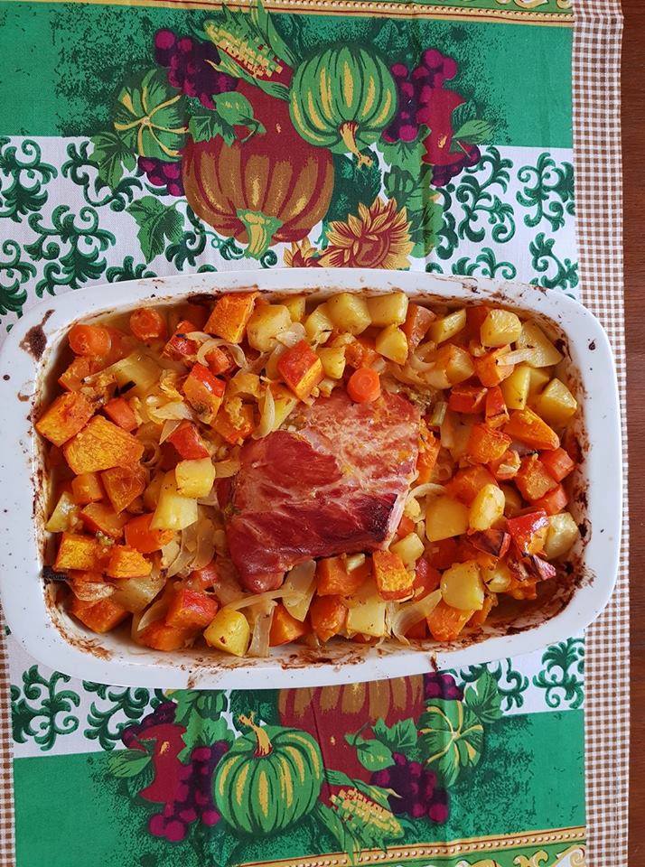 Den Kasslerbraten (vorgegart) mit 2 geschnittenen Zwiebeln und 1 El. Öl in Bräter, oder Auflaufform legen – ich habe es in den kalten Ofen auf 200 Grad ca. 25 min garen 8 1x wenden), dann das Gemüse, welches vorher in Schüssel mit Sahne, Öl und Gewürzen vermischt wurde zugeben und nochmals ca. 20 – 30 min garen