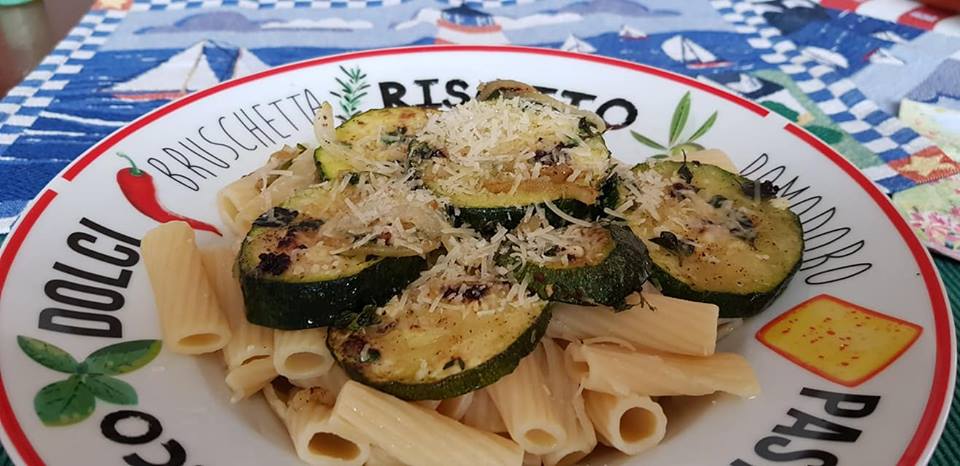Zucchini gebraten in Olivenöl, mit Zwiebeln, Knoblauch, Parmesan und Mediterranen Kräutern (evtl. Zuccini in Scheiben schneiden und salzen auf Küchenkrepp liegen lassen um sie etwas zu entwässern) dazu Pasta – Basta! -Kochtipp für die Zuccini Schwemme-