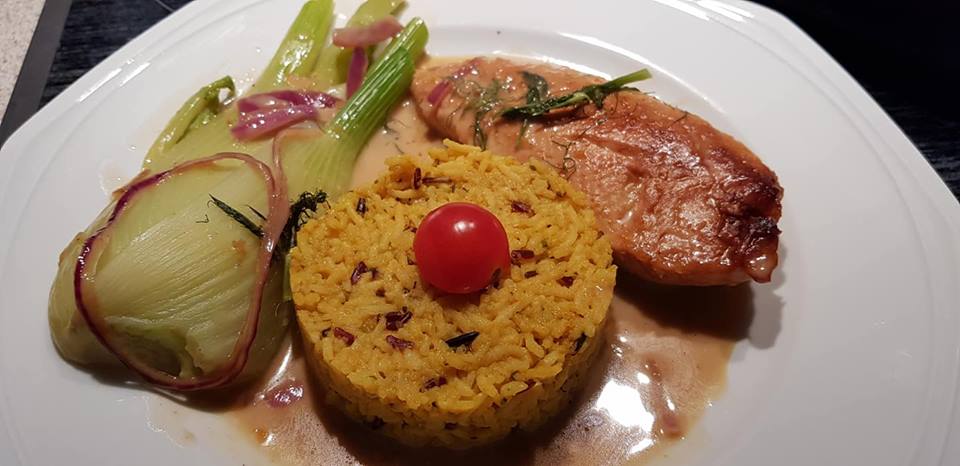 Die halbierten in Salzwasser bissfest vorgegarten Fenchel auch in die Bratpfanne legen und noch mal ca. 10 min bei 180° in den Backofen!