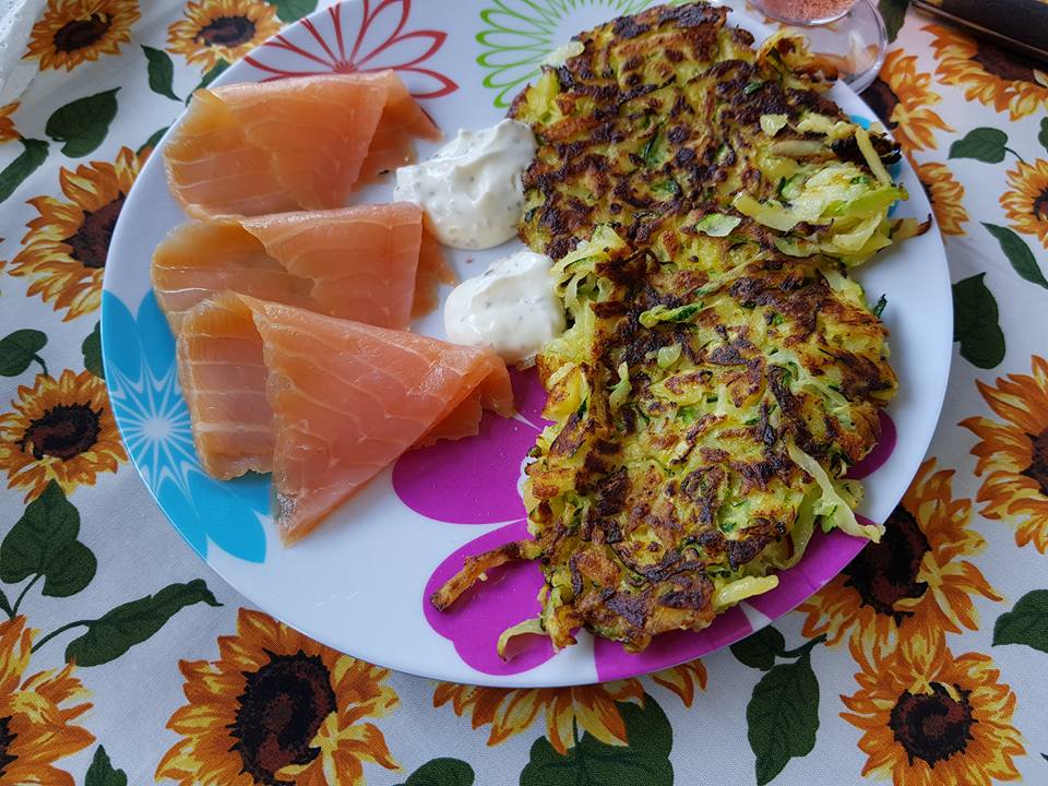 Zuccini raspeln, etwas Salz dazu und vermischen in Sieb mit Geschirrtuch geben ca. 15 min ziehen lassen dann gut ausdrücken, mit fein gehackter Zwiebel, zerdrückter Knobizehe, Salz, Pfeffer, Muskat, Eiern, etwas Mehl, oder Mondamin mischen, in Öl, oder Butterschmalz ausbacken!