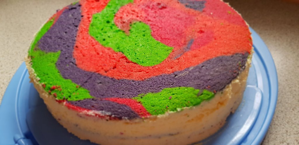 Teenie Tortte, zum 15. Geburtstag meiner Enkelin, so bunt wie das Leben mit 15….. Bunte Torte: Biskuitteig eingefärbt…