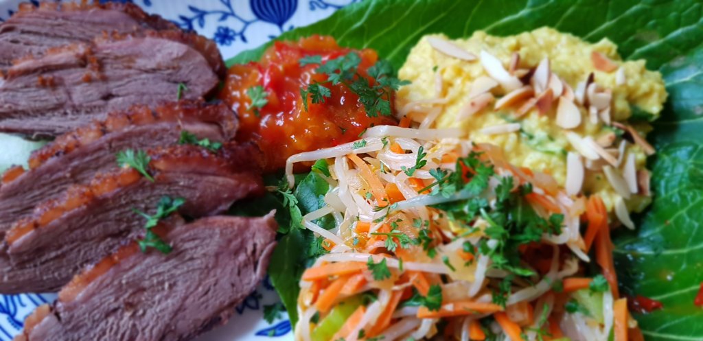 Mein Mann hat die Haut eingeschnitten, mit Salz und Grillgewürz eingerieben. Dann in Backofenfreste Form etwas Butterschmalz Geben und die Entenbrust bei 220 ° im vorgeheizten Backofen braten, nach ca. 25 – 30 min auf 200 Grad und nach weiteren ca. 20 min auf 100 Grad….halt nach Gefühl und immer danach schauen….