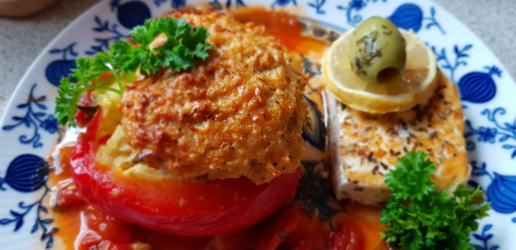 1 fein zerkleinert Knoblauchzehe in Öl andünsten und zu der Hirse in eine Schüssel geben, 150 g zerbröselter Schafkäse, oder anderer geriebenen Käse und 2 Eier zugeben, mit Salz, Pfeffer, Muskat abschmecken und in die Paprikahälften füllen.