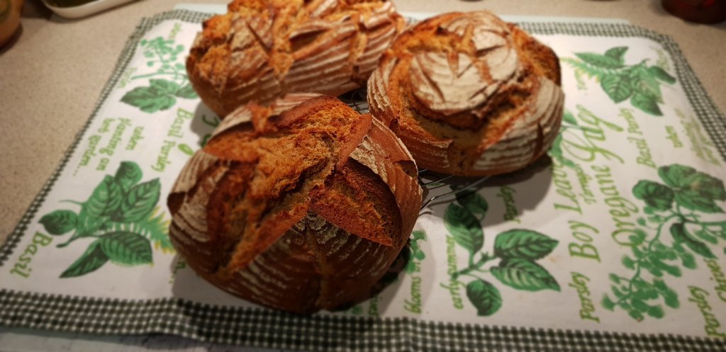 Backen mit Dampf 15 min bei 250 Grad, abdampfen und je nach Brotgröße noch 35-50 min bei 200 Grad