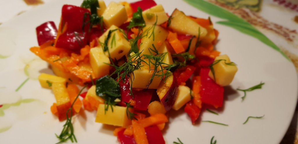 Nun gibt es verschiedene Varianten, wie ich den Salat zubereite, diesmal habe ich 4 fein zerkleinerte Karotten dazu und einen fein geschnittenen Apfel, viel Dill und Petersilie.
