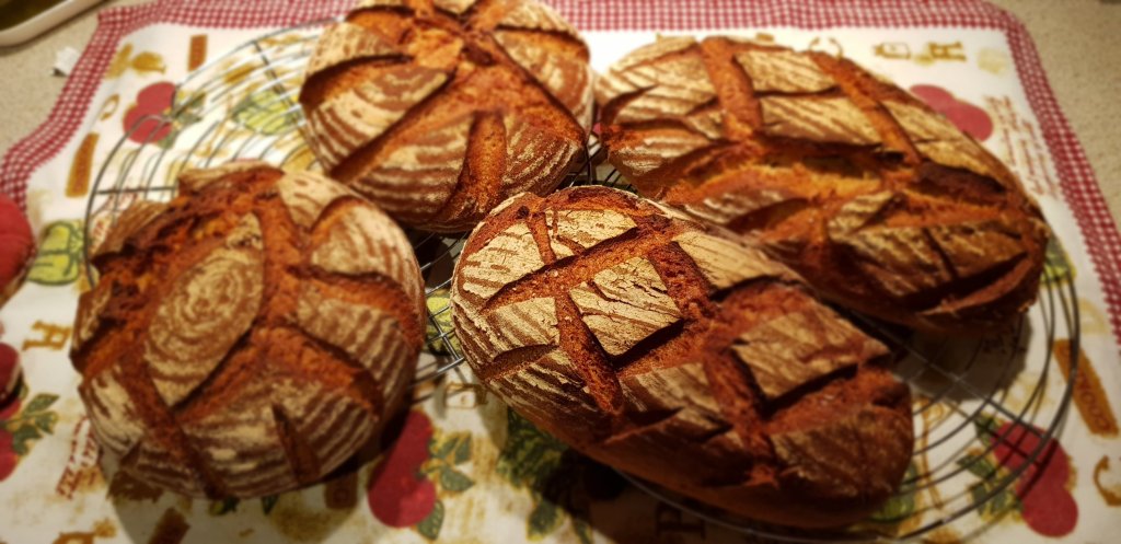 Backen mit Dampf 15 min 250 Grad, kurz abdampfen, dann noch ca. 40 min bei 200 Grad