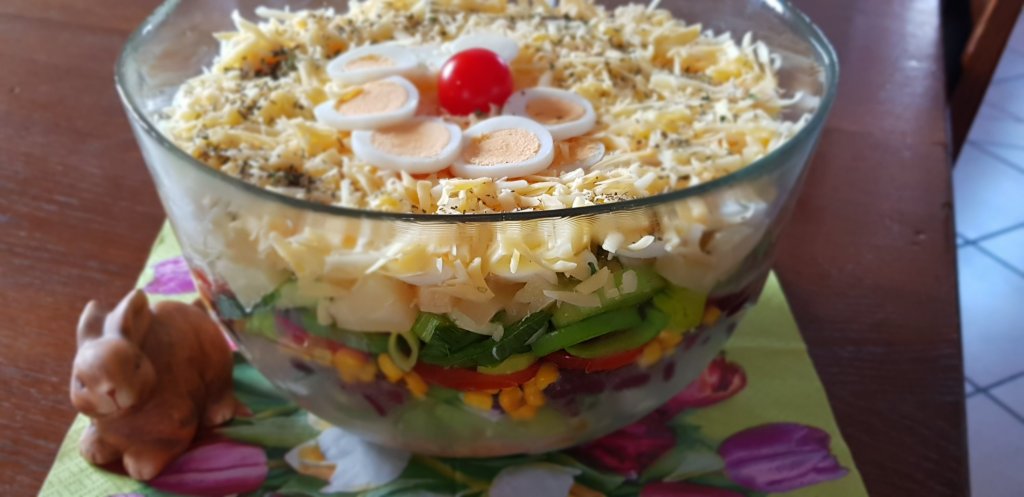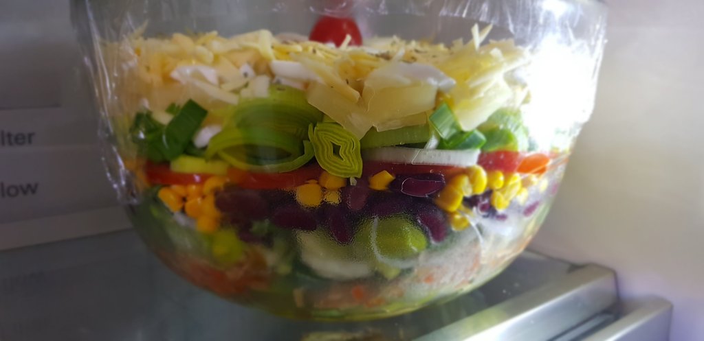 Die Schichten könnt Ihr farblich so einschichten, wie es Euch gefällt! Der Salat hält sich einige Tage im Kühlschrank!