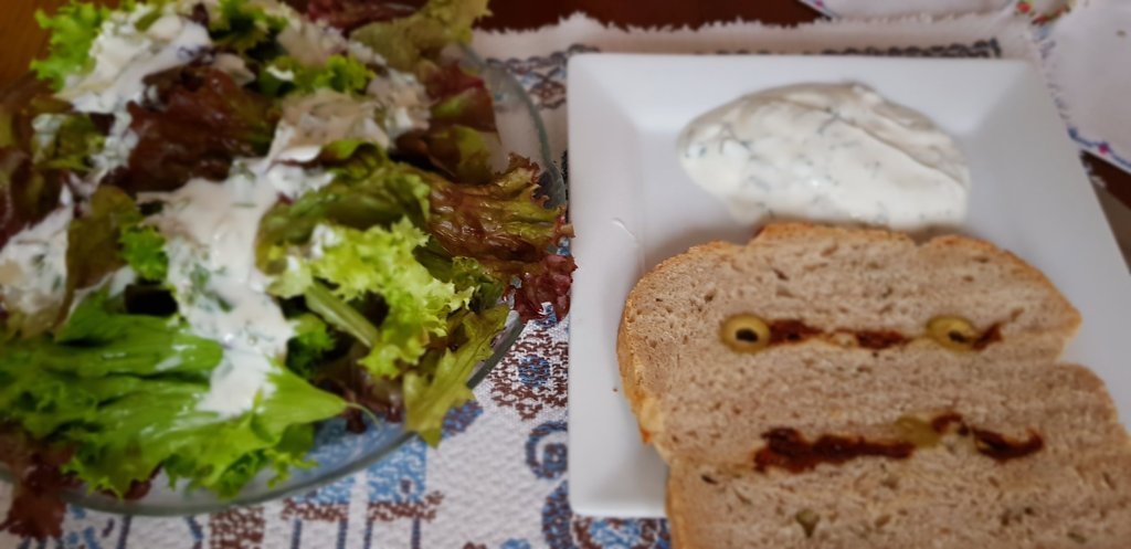 Abendessen, leckeres frisches Brot, Kräuter- Knobidipp und frischer Gartensalat!