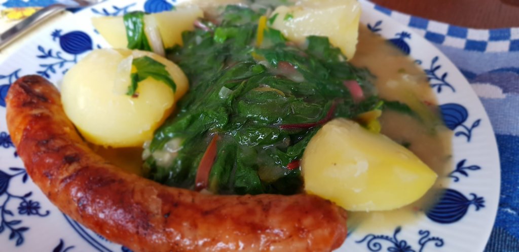 Mangold traditionell, mit Bratwurst und Salzkartoffeln