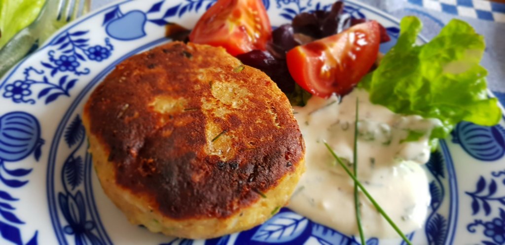 Alle Zutaten zu einem Kloßteig verkneten (wenn zu nass etwas Mehl, oder Weckmehl dazu), mit nassen Händen formen und in Butterschmalz braten!