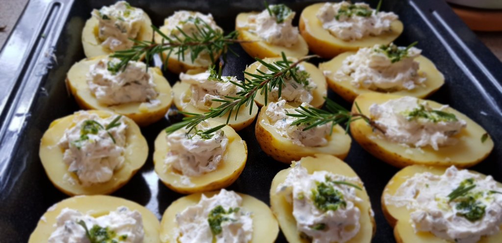 Gefüllte Kartoffeln am Vortag kochen, halbieren aushöhlen und ca. 1 cm Rand lassen.