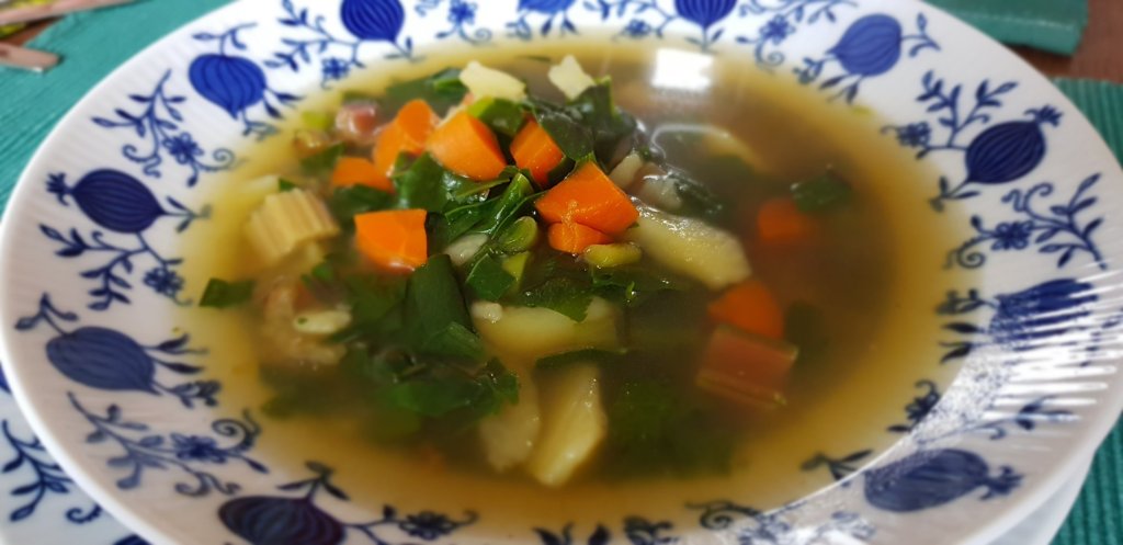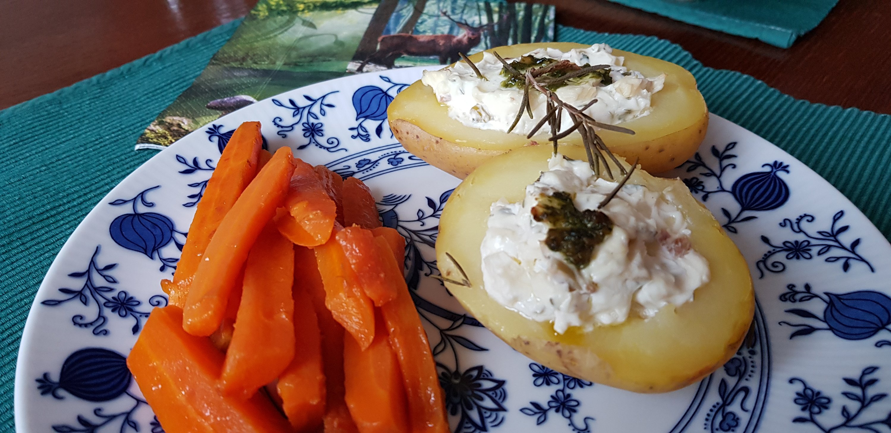 Ofenkartoffeln gefüllt mit Olivencreme, dazu glasierte Karotten, vorweg gab es eine Gemüsesuppe aus der Karottenbrühe, mit dem ausgehöhlten der Kartoffeln, Karotten und Gartengemüse, Suppengrün