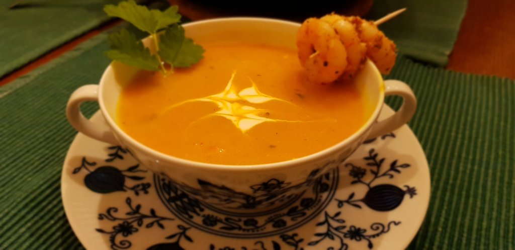 Kürbis- Kokoscremesüppchen mit gebratenen Garnelen, dazu Baguette….