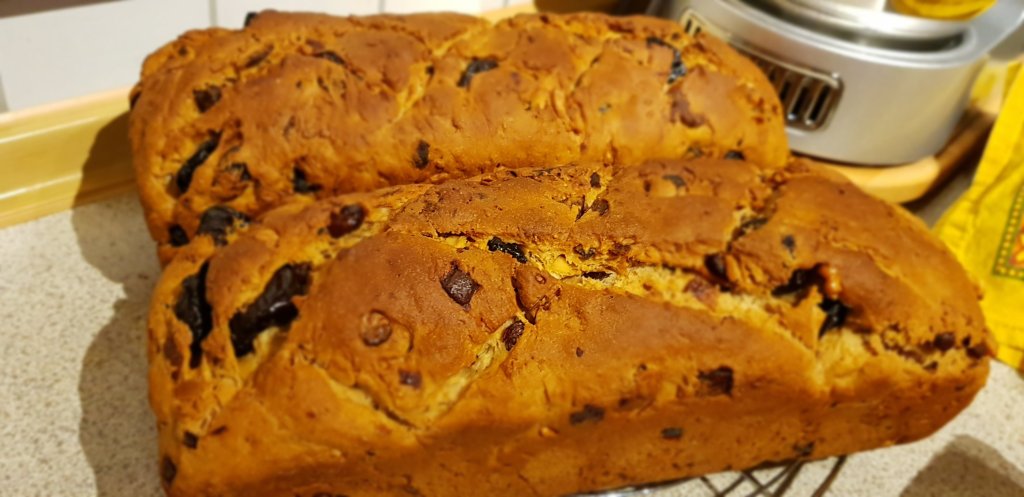 Es ist ein gutes Kilo Trockenobst und Nüsse drin, nicht im einzelnen gewogen: Pflaumen, Datteln, Rosinen, Feigen, Aprikosen, Walnüsse, Mandelblättchen, Zitronenabrieb, es war das was ich gerade da hatte…