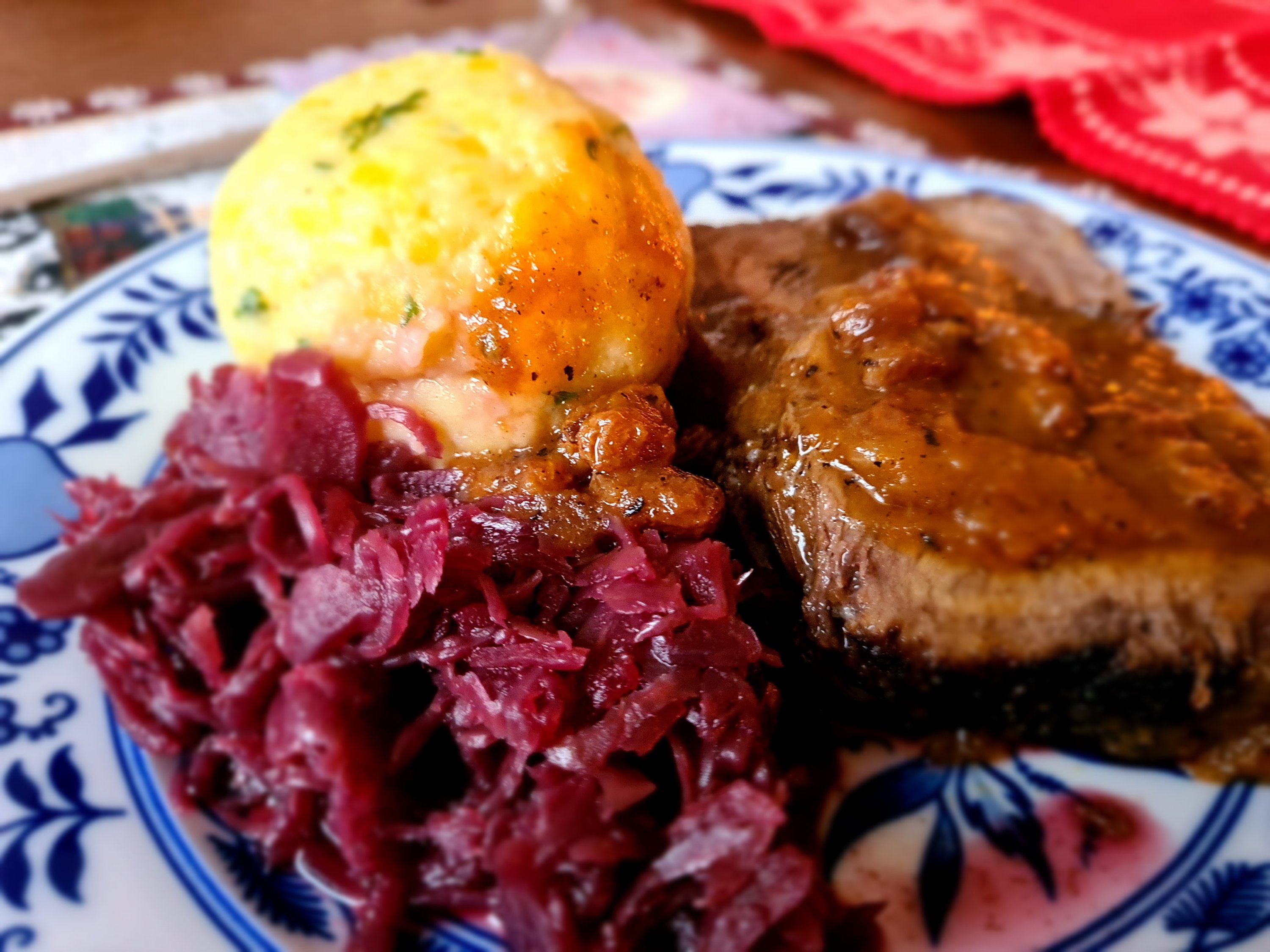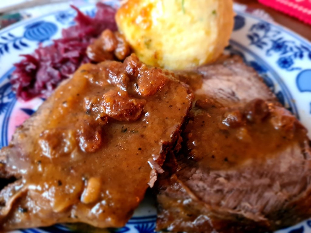 Das Fleisch trocken tupfen und in Butterschmalz scharf von allen Seiten anbraten, aus dem Topf nehmen und 2 gr. Zwiebeln anbräunen, das Fleisch wieder in den Topf geben, ich habe noch 2 Karotten mit in den Topf und mit soviel Wasser und ca. 2 Soßenkellen Marinade auffüllen, das dass Fleisch mindestens zur Hälfte bedeckt ist. Nun den Braten je nach Stärke 1,5 – 2 Stunden mäßig kochen lassen, ab und zu umdrehen. Mit spitzem Messer einstechen um zu prüfen ob der Braten gar ist!
