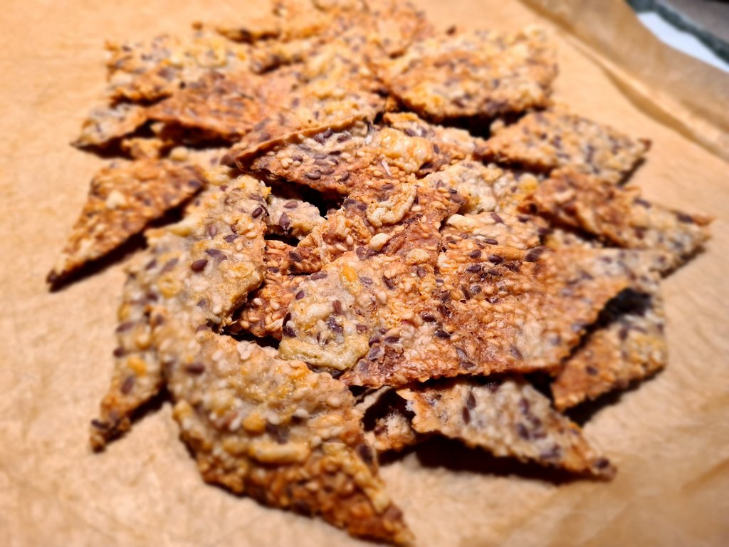 Alle Zutaten zu einem Teig verarbeiten, ca 15 min ruhen lassen, der Teig muss gut streichfähig sein, dass man ihn dünn auf ein mit Backpapier ausgelegtes Blech streichen kann (ergibt 2 Bleche). Dann mit ganz wenig Reibekäse bestreuen.