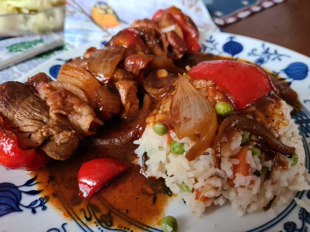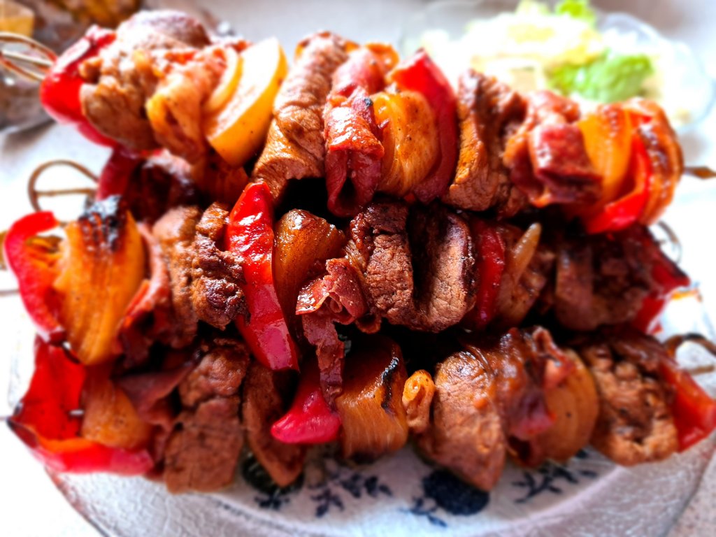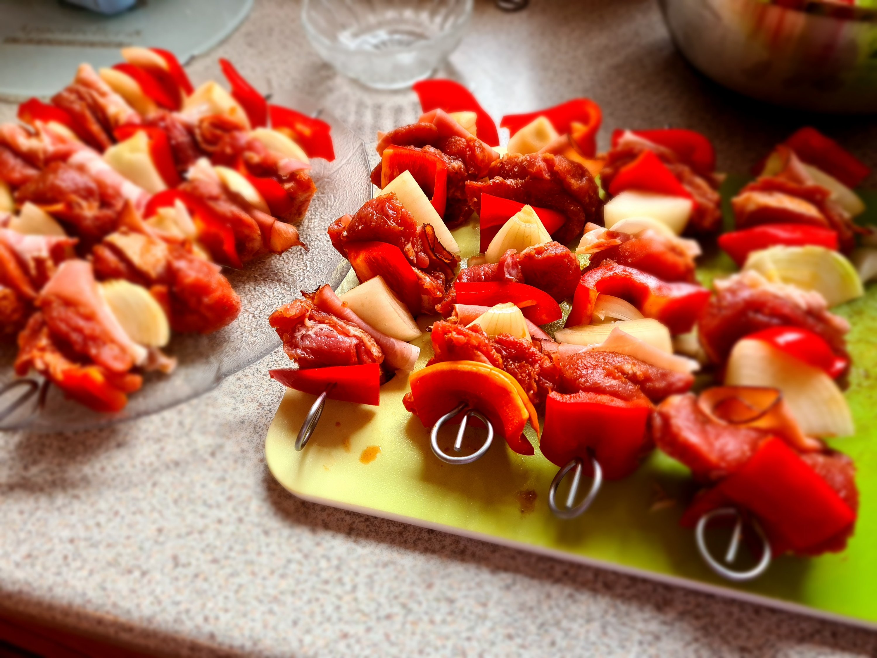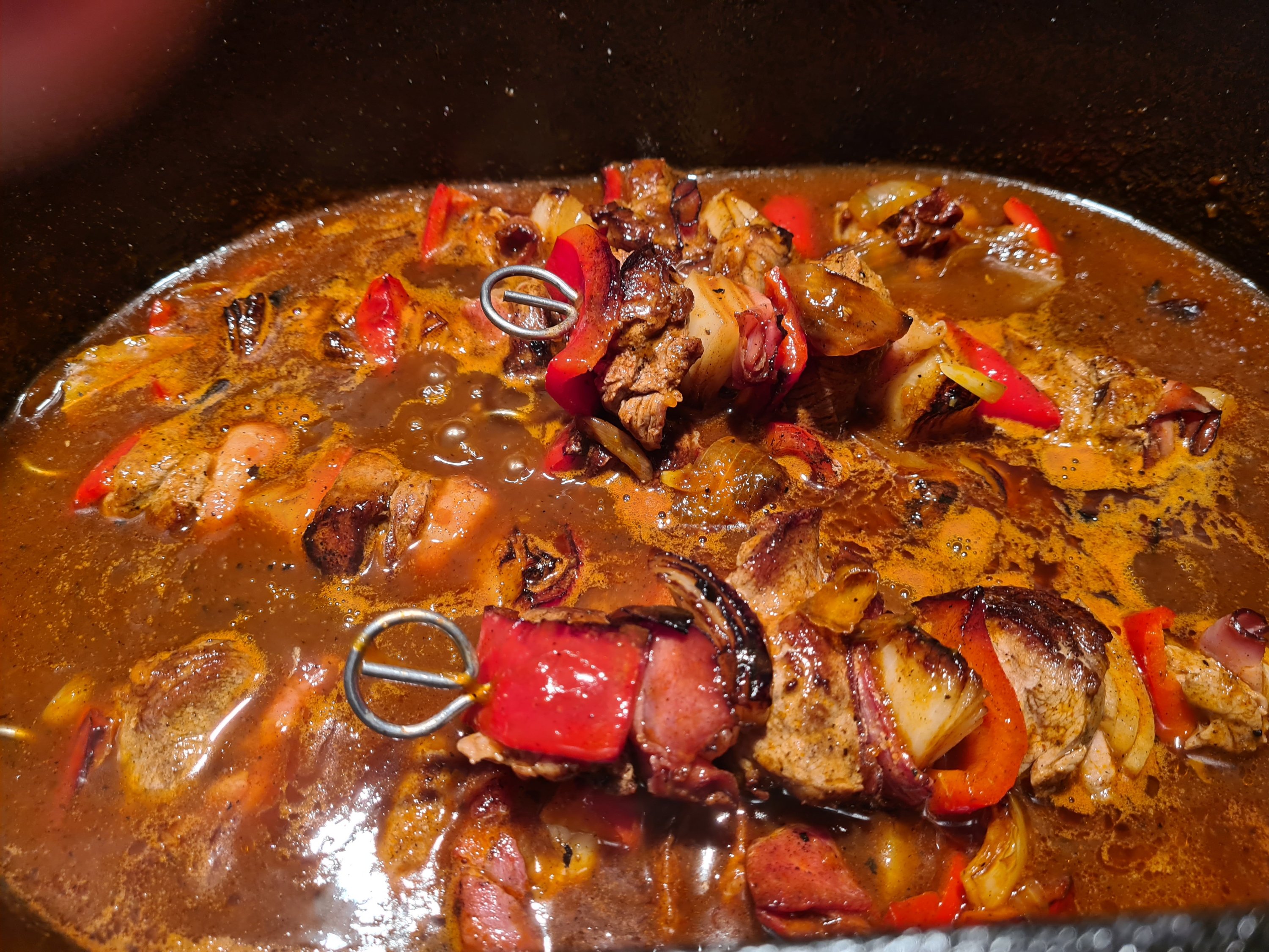 Die Fleischstückchen würzen und im Wechsel mit Speck/Dörrfleisch, oder Schinken, Zwiebeln, Paprika aufspiessen, scharf anbraten aus dem Topf nehmen und eine oder auch mehr Zwiebeln, evtl.Rest Paprika anbräunen, dann1 Knoblauchzehe fein geschnitten noch kurz mit bräunen und je nach Menge ca. 3 Esslöffel Tomatenmark kurz anrösten, mit 300 – 500 ml Wasser auffüllen, 1 Flasche fertige Schaschliksoße zugeben und die Spieße in den Topf geben, ich habe noch einen kräftigen Schuß Rotwein und 2 Lorbeerblätter dazu…