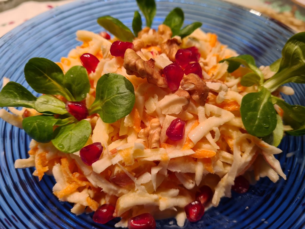 Waldorfsalat, zum Standard Rezept habe ich noch geraspelte Karotten dazu! Ich esse diesen Salat sehr gerne und es ist ein Salat den man im Winter aus regionalem Gemüse/Obst machen kann! Zutaten: Sellerie geraspelt Äpfel geraspelt Saft einer Zitrone Essig, Öl, Salz, Saure Sahne Mayonnaise Walnusskerne klein gehackt