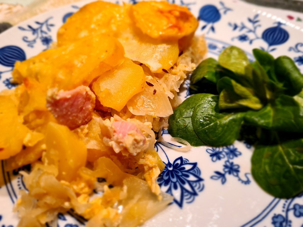 In die Auflaufform Schichtweise Kartoffeln und Krautmischung füllen (in großer Form unten Kartoffeln, Kraut, oben Kartoffeln