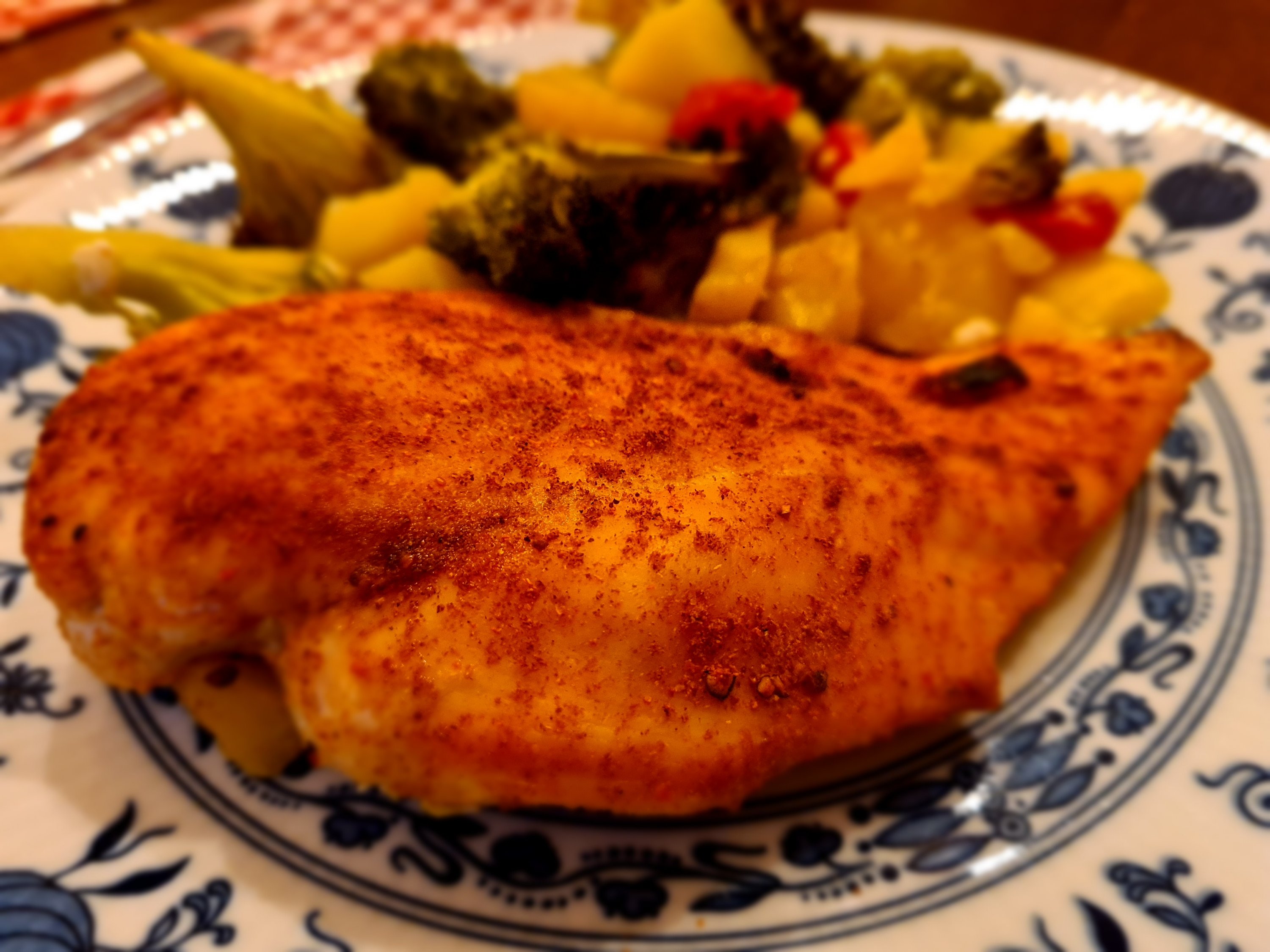 Im vorgeheizten Backofen bei 200 Grad ca. 30- 40 min garen, so daß die Hähnchenbrustfilet gar sind, oder vorher anbraten, dann geht es schneller…