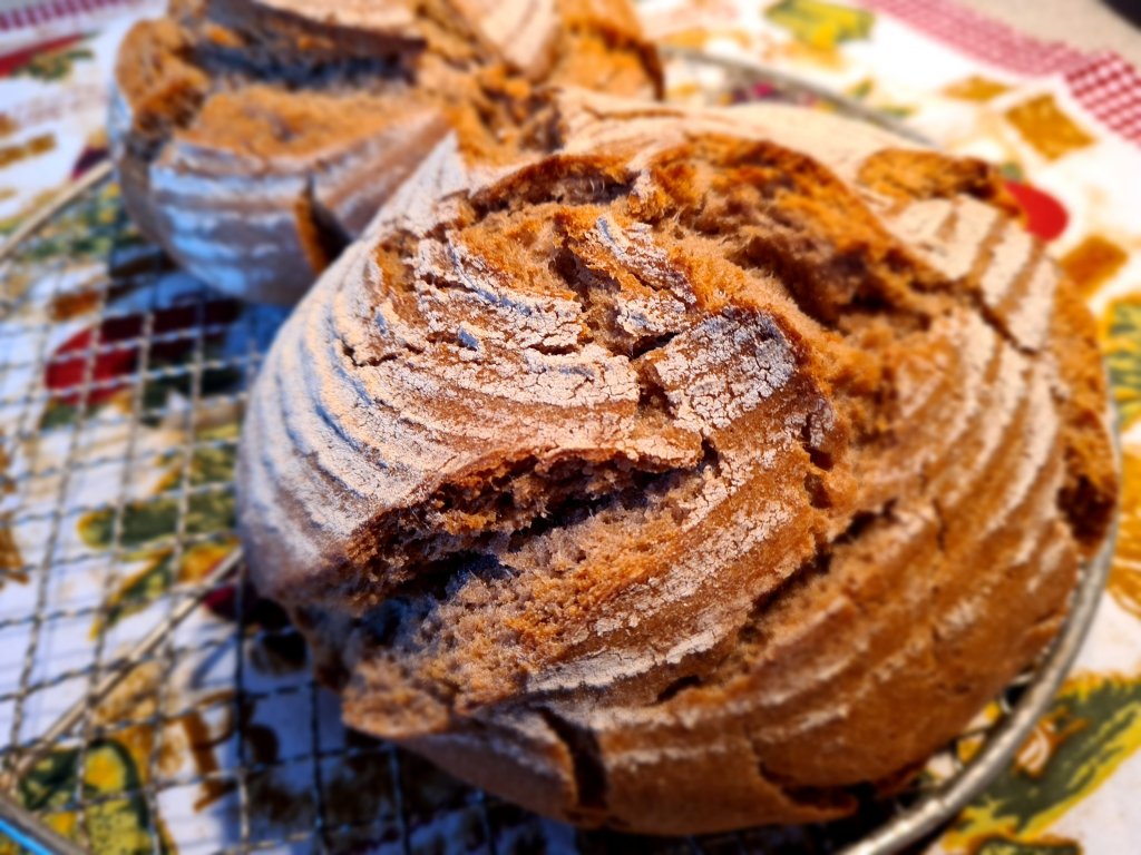 Aus allen Zutaten Brotteig herstellen und dann in geölter Schüssel zugedeckt gehen lassen, ca. 3 Stunden, Brote formen und nochmal im Gärkörbchen gehen lassen…