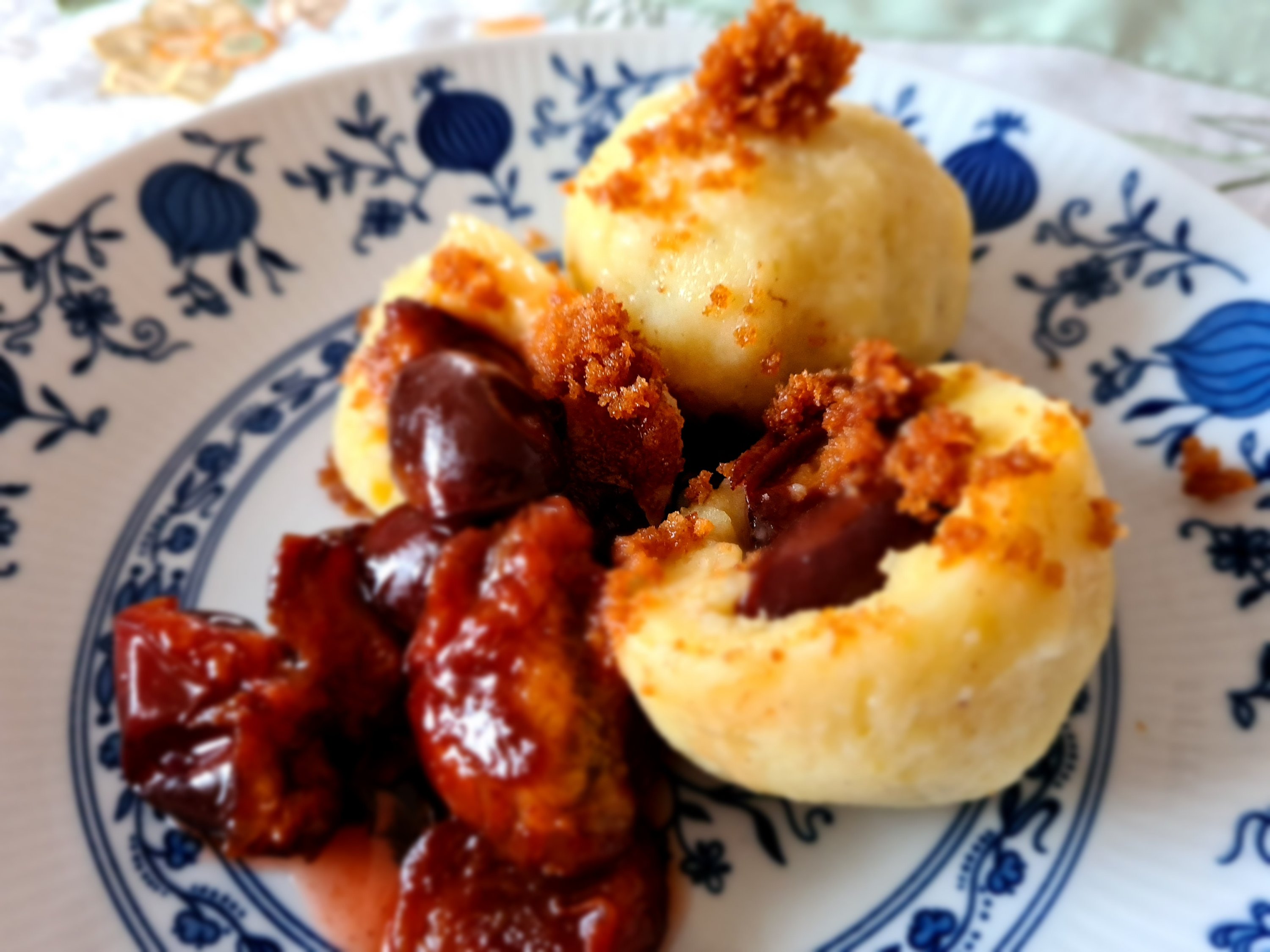 Knödel formen und jeweils in die Mitte 1 Zwetschge mit einem Stück Würfelzucker geben.