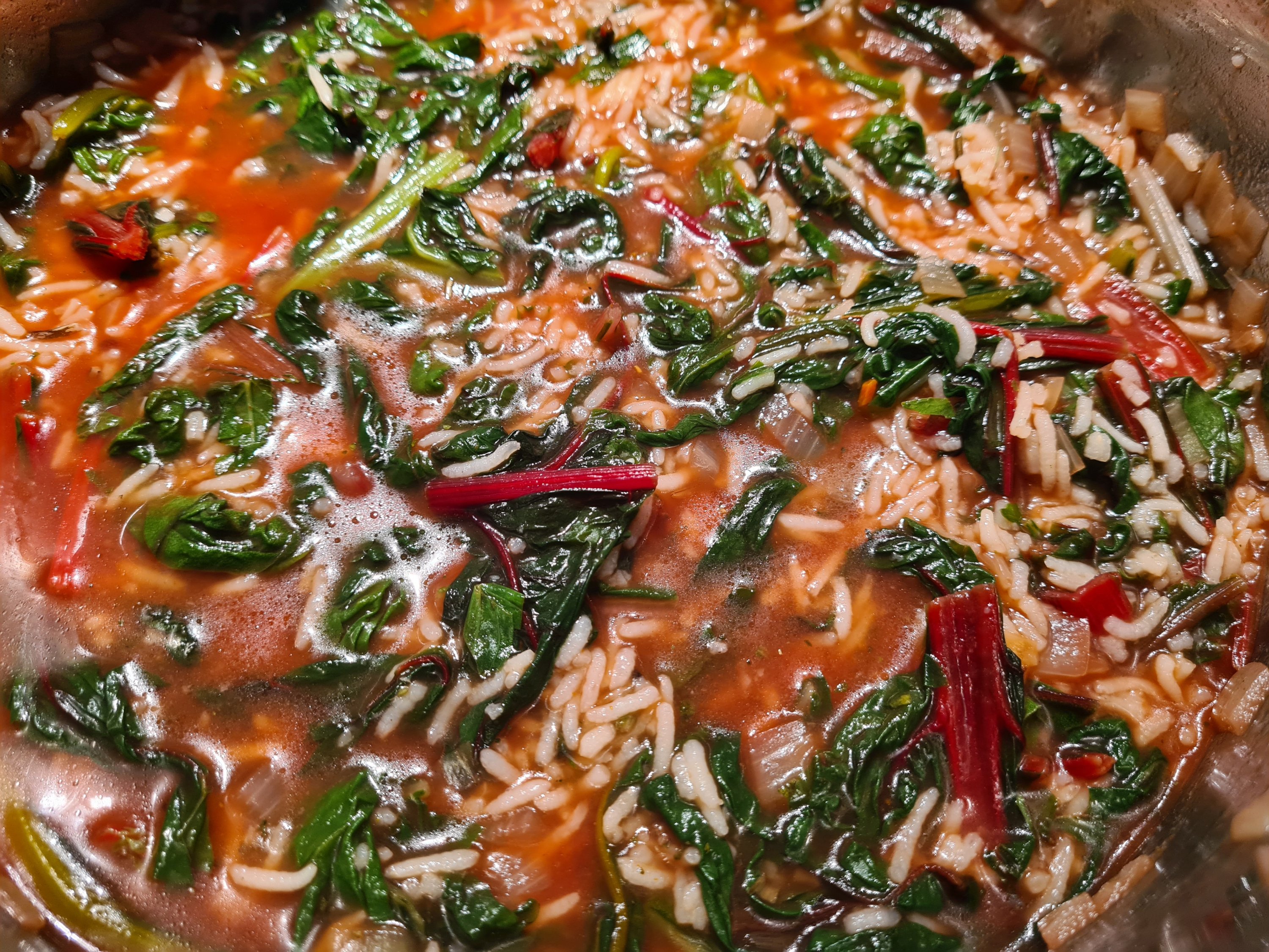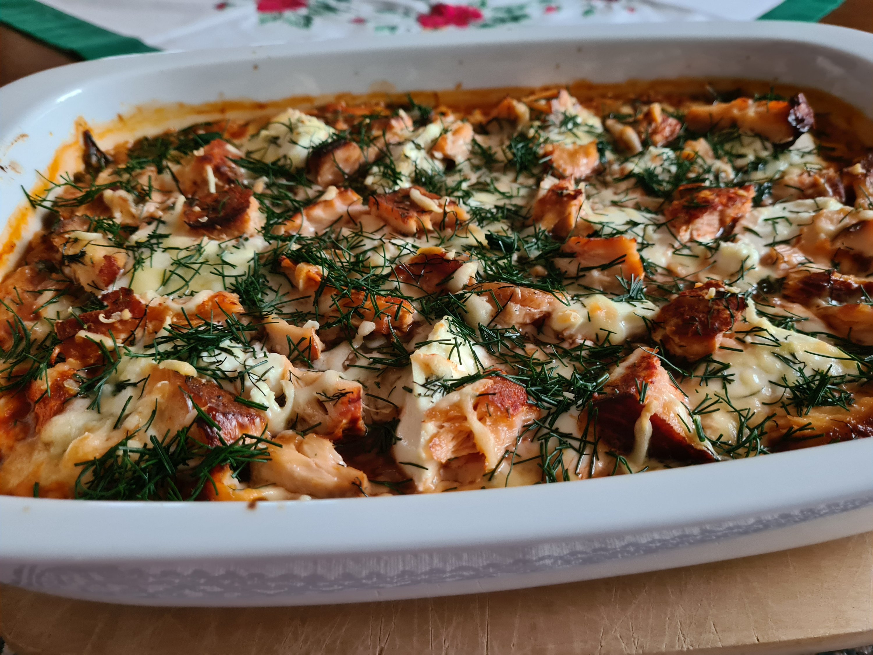 Mangold in Tomatenreis, mit Lachs und Käse überbacken