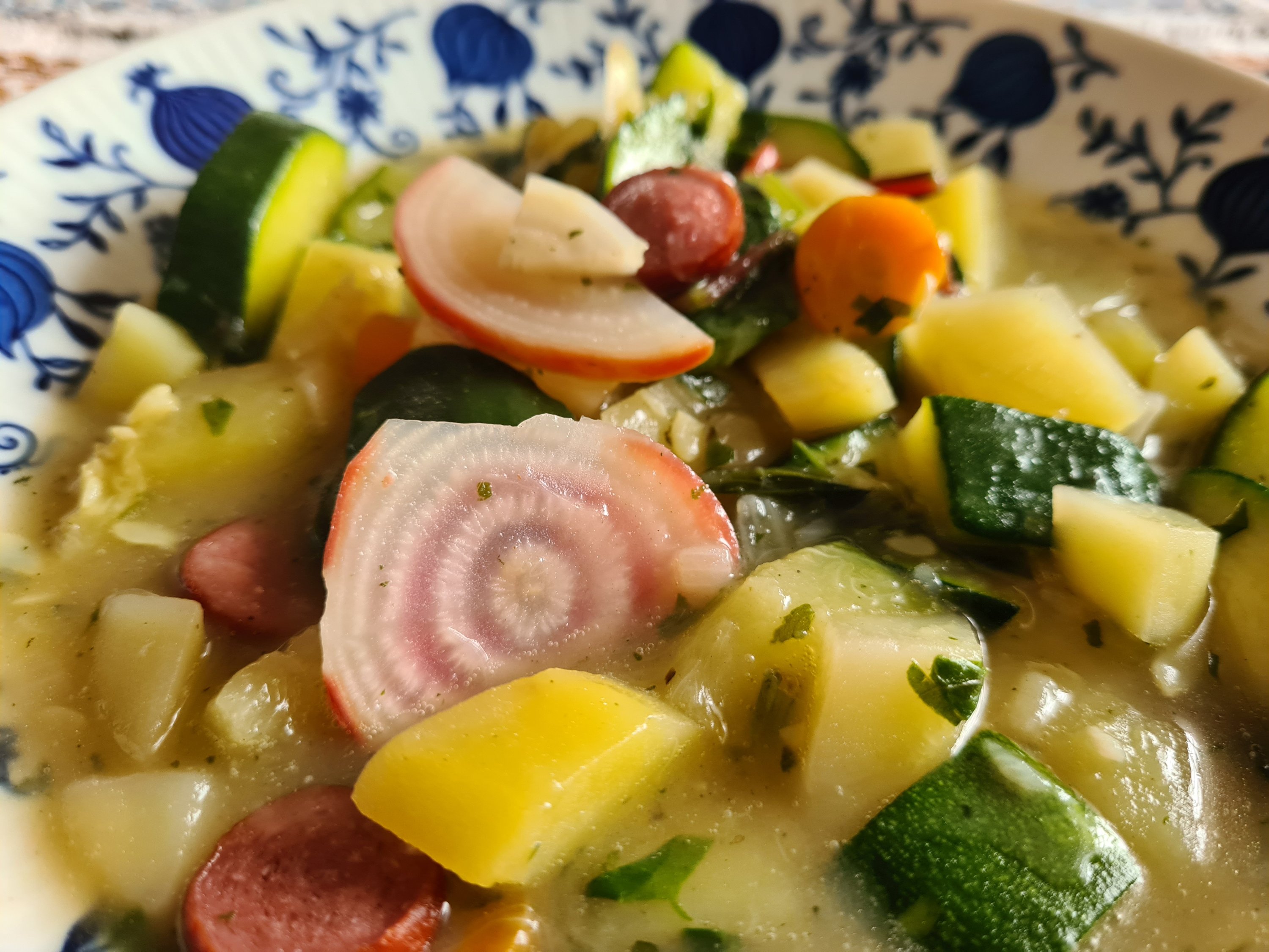 Nun kommen zuerst ca. 6- 8 klein gewürfelte Kartoffeln dazu, dann eine große, oder mehrere kleine in Würfel geschnittene Zucchini, 3 Karotten in Scheiben und weiteres Gemüse was man mag, oder so lassen (ich habe noch 2 Ringelbeete und 3 Beeteblätter dazu) unter rühren leicht köcheln bis die Kartoffeln gar sind, mit Salz, frisch gemahlenem Pfeffer, Muskat abschmecken, wer mag mit Sahne verfeinern!